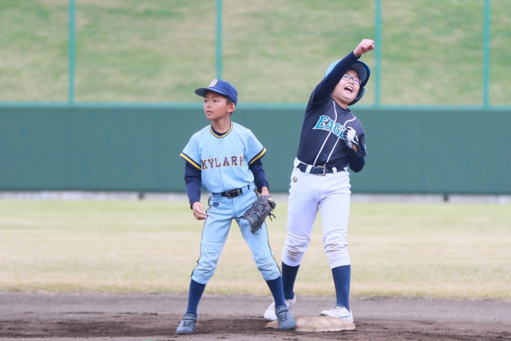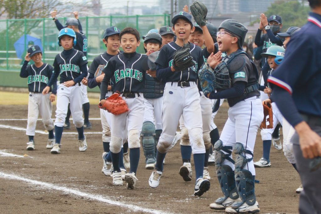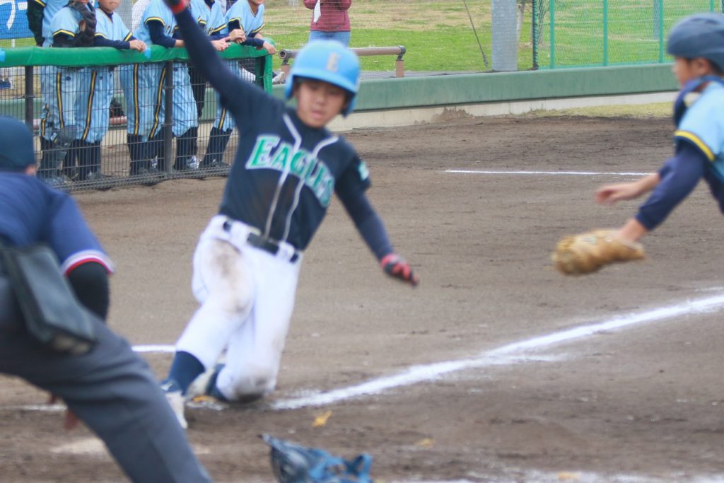 今日の対戦相手は片瀬スカイラークスBさんで、夏季大会1回戦で敗退した相手です。5年生中心のチームですが、2部の覇者というだけあり前回同様堅実な守備でミスが少ない強敵です。3点先制したものの、逆にイーグルスのミスで失点し1点差に追い上げられた時は、前回の悪夢がよぎりましたがスクイズなどで地道に追加点を重ね、なんとか勝利することができました!!